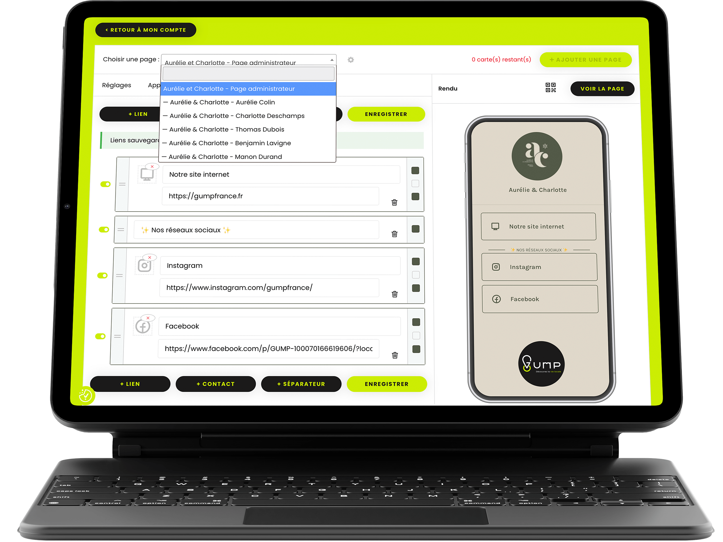 Grâce à la page administrateur depuis votre espace personnel, vous avez une vision globale et vous gérez l’ensemble des profils associés. Cela vous permet d’effectuer des modifications groupées sur vos multi-liens.